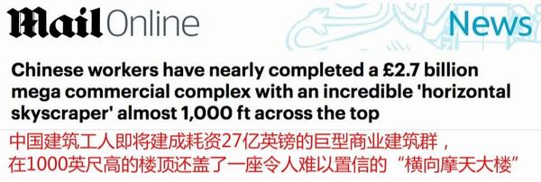 英國(guó)《每日郵報(bào)》用了整整三行的標(biāo)題這樣形容:“中國(guó)建筑工人即將建成耗資27億英鎊的巨型商業(yè)建筑群,在1000英尺高的樓頂還蓋了一座令人難以置信的‘橫向摩天大樓’”。