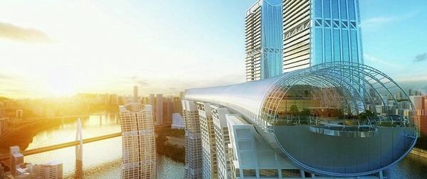 說“橫向”,是因?yàn)?幢拔地而起的摩天大樓群里,赫然出現(xiàn)一座“躺著”的樓。這座長(zhǎng)度超過300米的廊橋形建筑在60層樓的高空將其中四幢摩天大樓連接起來,瞬間把建筑群變成3D的“風(fēng)帆”。