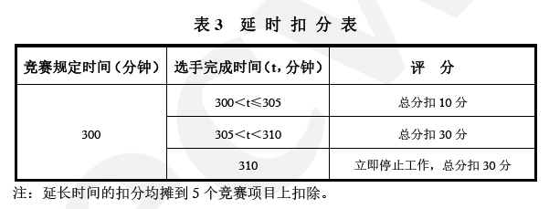 2)選手在規定時間內未完成競賽項目時,最長可以允許延時10分鐘的比賽時間,延時10分鐘到達后須立即停止操作。對延長的競賽時間,按規定扣除相應分數。