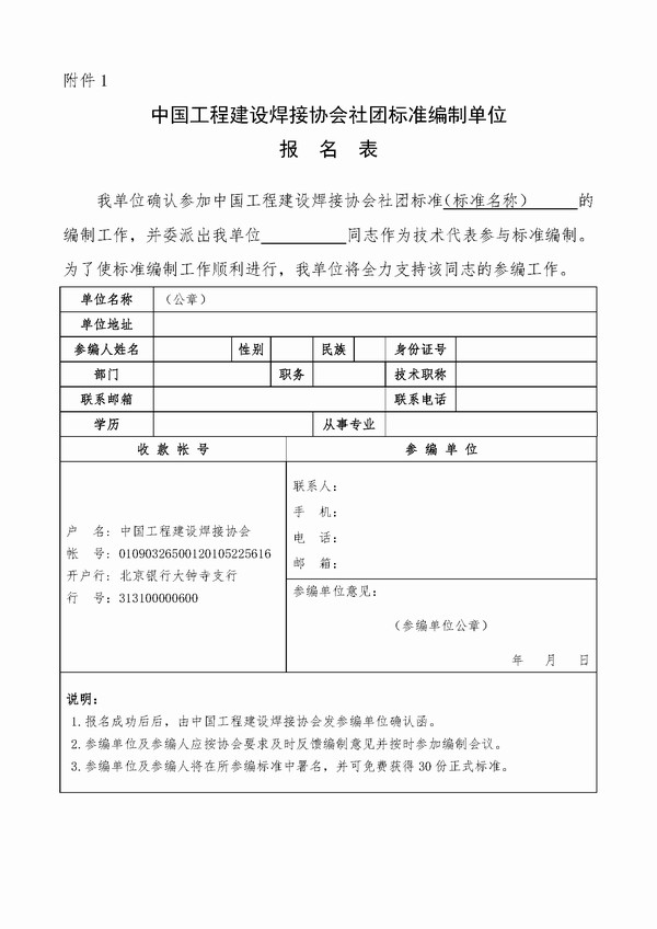 1.填寫“中國工程建設(shè)焊接協(xié)會團體標準參編單位報名表”(見附件1),單位負責人簽署意見并加蓋公章;