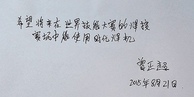 從第41屆世界技能大賽開始,焊接項目的培訓和選拔賽一直使用北京時代的電焊機。“時代焊機,中國品牌”,“時代焊機,國賽用機”,歷屆大賽選手對時代焊機非常熟悉,對時代產品具有特殊的感情。在第43屆世界技能大賽巴西比賽現場,舉辦方選用的是美國林肯焊機。曾正超和周樹春教練結合比賽期間的現場感受,和時代團隊溝通了時代焊機和國外品牌產品的性能對比和差異,對代表中國品牌的時代焊機的發展提出期望,世界冠軍曾正超親筆題寫:“希望將來在世界技能大賽的焊接賽場中能使用時代焊機”。