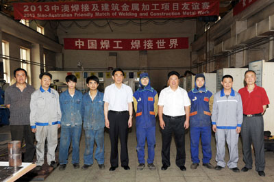 王曉初、國文清一行首先來到第42屆世界技能大賽焊接及建筑金屬加工項目集訓基地現場參觀并看望備戰選手,并對選手寄予殷切期望。