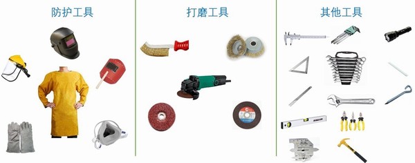 手電筒、石筆、鉗子、活口扳手、內六角、呆扳手、劃針、錘子、扁鏟、鑿子、銼刀等。