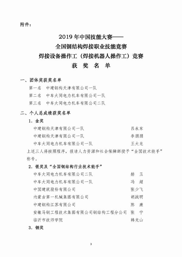 2019年中國技能大賽——全國鋼結構焊接職業技能競賽焊接機器人操作工競賽表彰決定