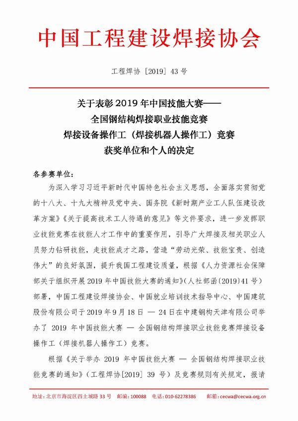 點擊下載《2019年中國技能大賽——全國鋼結構焊接職業技能競賽焊接機器人操作工競賽表彰決定》(工程焊協 [2019]43號)