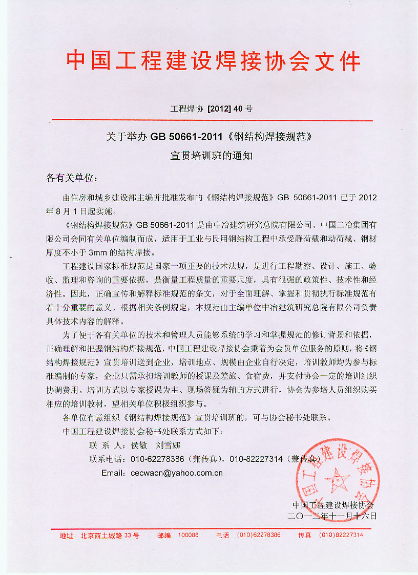 舉辦GB 50661-2011《鋼結構焊接規范》宣貫的通知