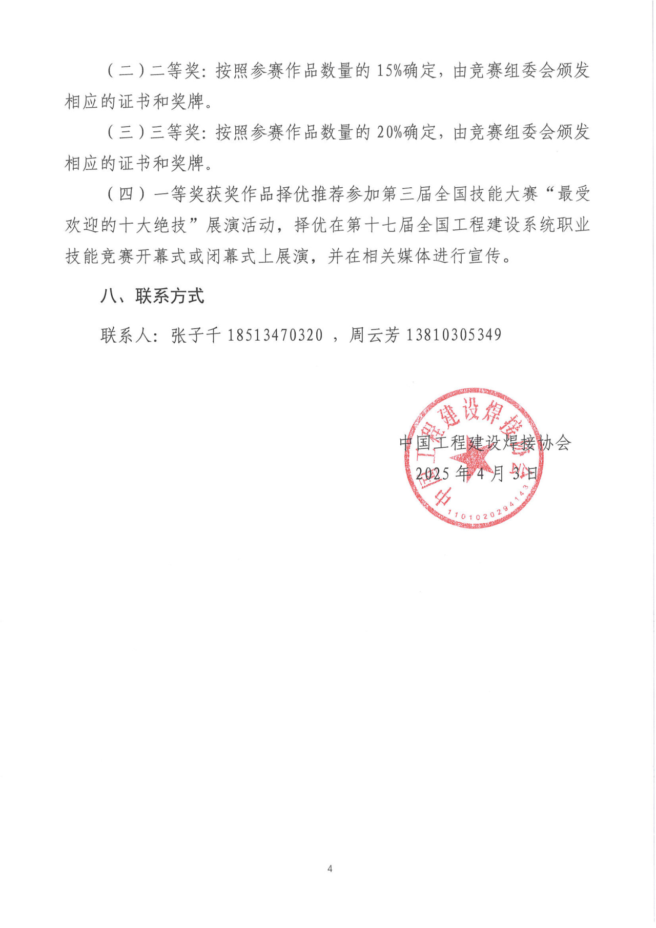 一等獎獲獎作品擇優推薦參加第三屆全國技能大賽“最受歡迎的十大絕技”展演活動,擇優在第十七屆全國工程建設系統職業技能競賽開幕式或閉幕式上展演,并在相關媒體進行宣傳。