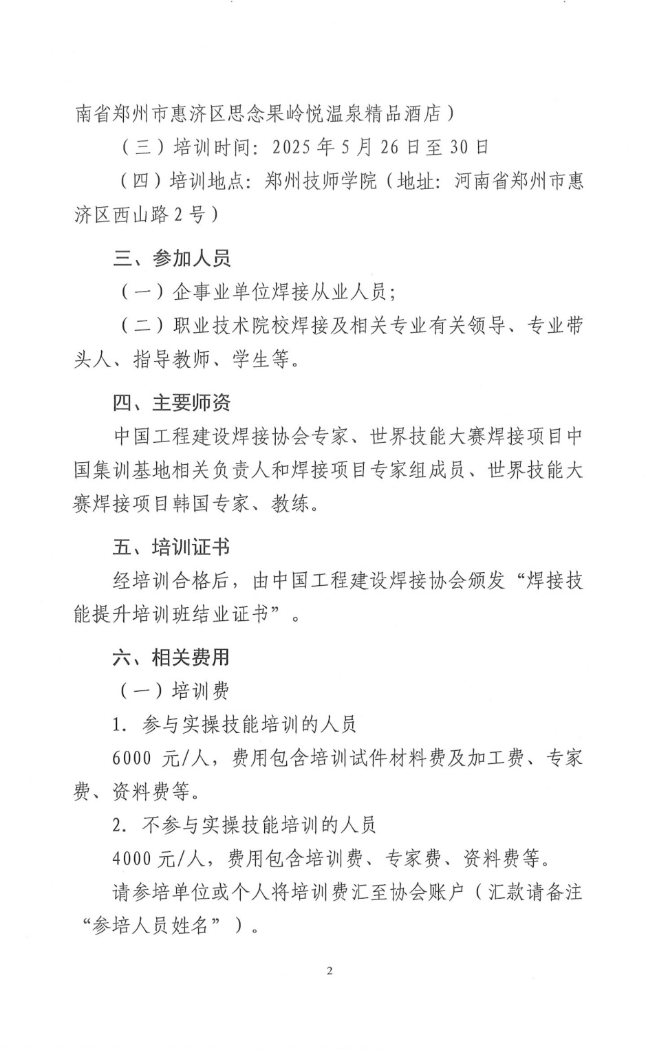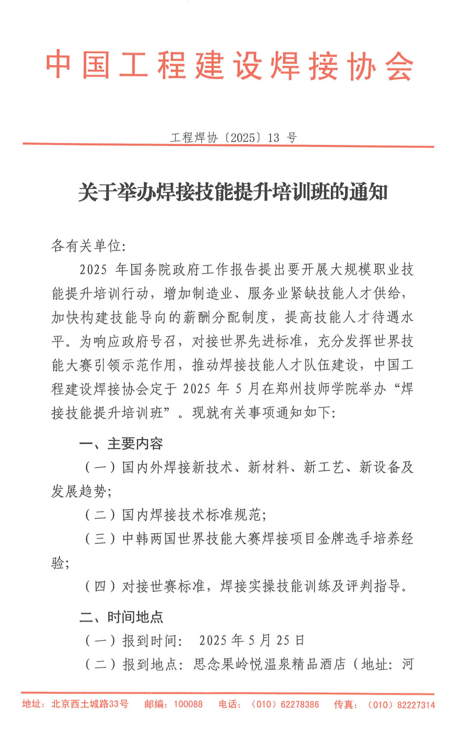 2025年國務院政府工作報告提出要開展大規模職業技能提升培訓行動,增加制造業、服務業緊缺技能人才供給,加快構建技能導向的薪酬分配制度,提高技能人才待遇水平。為響應政府號召,對接世界先進標準,充分發揮世界技能大賽引領示范作用,推動焊接技能人才隊伍建設,中國工程建設焊接協會定于2025年5月在鄭州技師學院舉辦“焊接技能提升培訓班”。