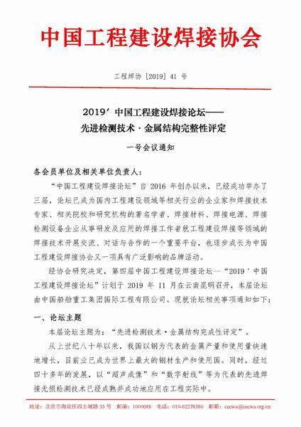 點擊下載《工程焊協[2019]41號 2019‘中國工程建設焊接論壇一號通知》