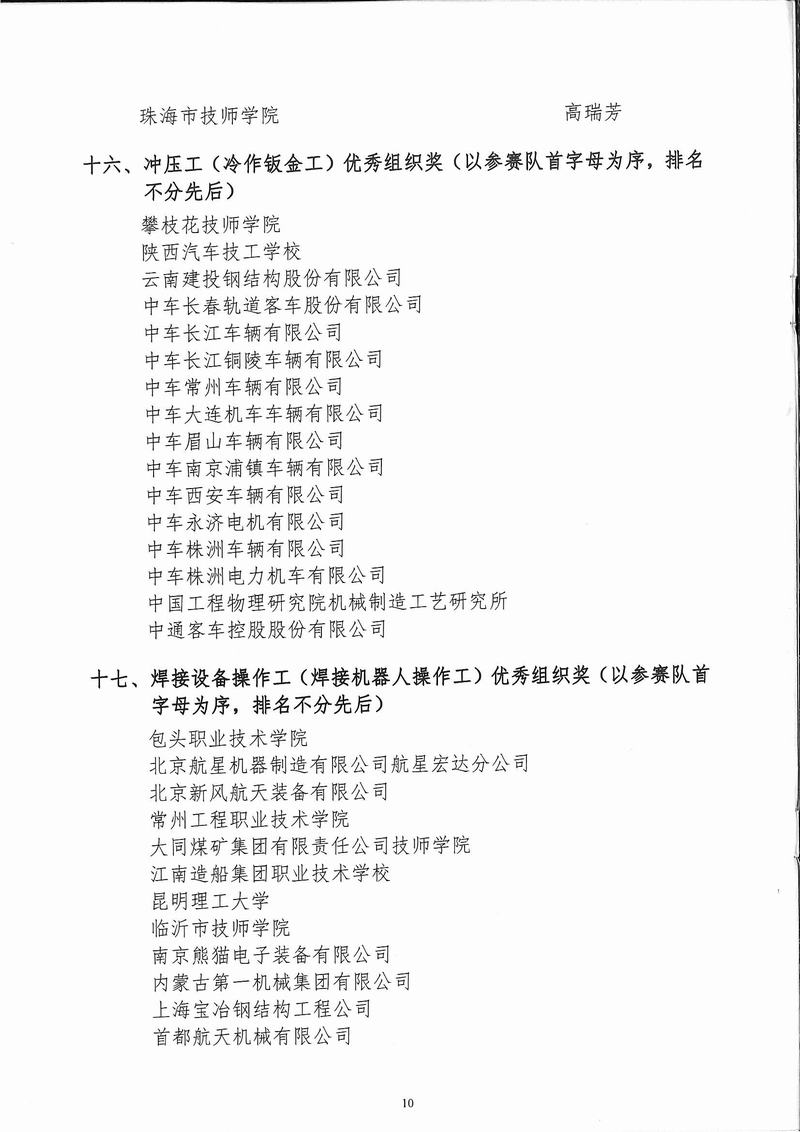 根據(jù)《人力資源社會保障部關(guān)于組織開展2020年全國行業(yè)職業(yè)技能競賽的通知》(人社部函〔2020〕30號)部署,中國工程建設(shè)焊接協(xié)會、人力資源社會保障部中國就業(yè)培訓(xùn)技術(shù)指導(dǎo)中心于2020年10月19日 — 11月1日分別在陜西汽車技工學(xué)校和大同機(jī)車技師學(xué)院舉辦了2020年全國行業(yè)職業(yè)技能競賽——全國智能焊接職業(yè)技能競賽。來自各省、自治區(qū)、直轄市,各行業(yè)共計65個代表隊的138名選手分別參加了沖壓工(冷作鈑金工)、焊接設(shè)備操作工(焊接機(jī)器人操作工)競賽。參賽選手在比賽中頑強(qiáng)拼搏,表現(xiàn)出精湛的技能和良好的精神風(fēng)貌,充分展示新時代技術(shù)工人不畏困難、勇攀高峰的風(fēng)采,一批優(yōu)秀技能人才脫穎而出。為表彰先進(jìn),樹立典型,根據(jù)《關(guān)于舉辦2020年全國行業(yè)職業(yè)技能競賽——全國智能焊接職業(yè)技能競賽的通知》(工程焊協(xié)[2020] 30 號)及競賽有關(guān)規(guī)定,報請全國智能焊接職業(yè)技能競賽組委會批準(zhǔn)同意,決定對獲得競賽團(tuán)體優(yōu)勝的陜西汽車技工學(xué)校、中車大同電力機(jī)車有限公司、北京航星機(jī)器制造有限公司航星宏達(dá)分公司等單位和黨金鑫、李顏清、楊延霖、顏丙堯等個人予以表彰。對組織有序、成績優(yōu)異的中車南京浦鎮(zhèn)車輛有限公司、臨沂市技師學(xué)院等單位授予優(yōu)秀組織獎(獲獎單位和個人名單附后)。對沖壓工(冷作鈑金工)競賽職工組前三名選手黨金鑫、鄭江華、胡敏;焊接設(shè)備操作工(焊接機(jī)器人操作工)競賽職工組前三名選手李顏清、杜家偉、韓光山報請人力資源社會保障部授予“全國技術(shù)能手”榮譽(yù)。