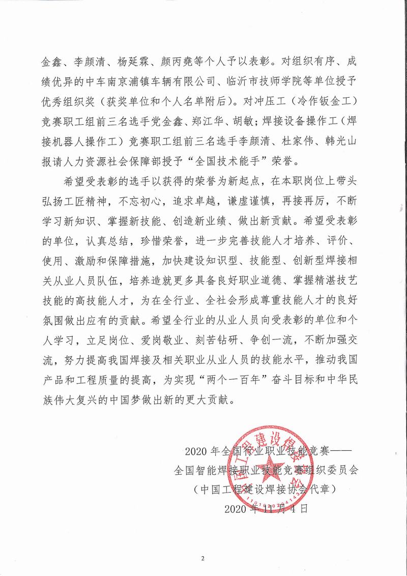 2020年全國行業(yè)職業(yè)技能競賽——全國智能焊接職業(yè)技能競賽表彰決定