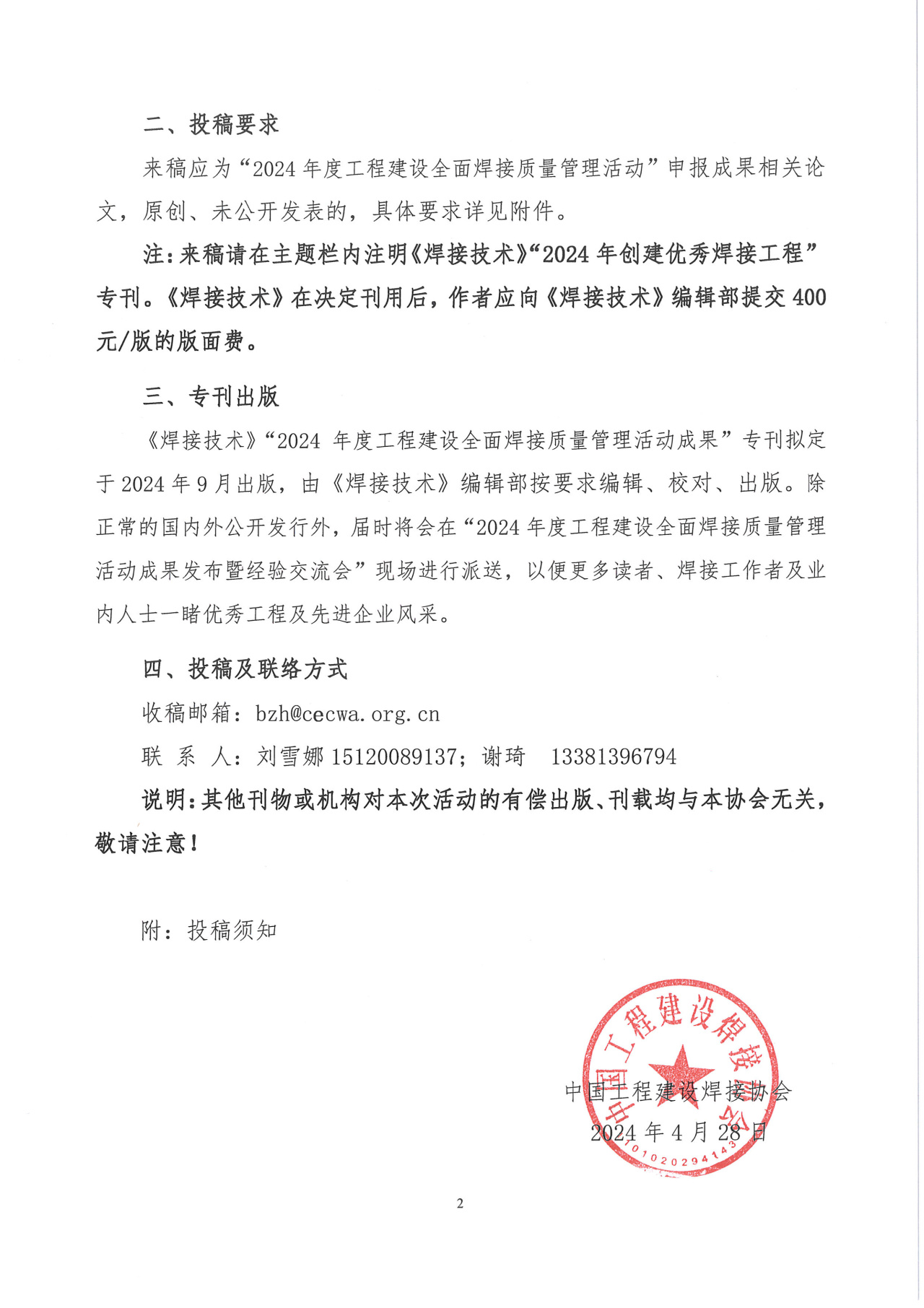 中國工程建設(shè)焊接協(xié)會2024年度工程建設(shè)全面焊接質(zhì)量管理活動成果評價征稿通知