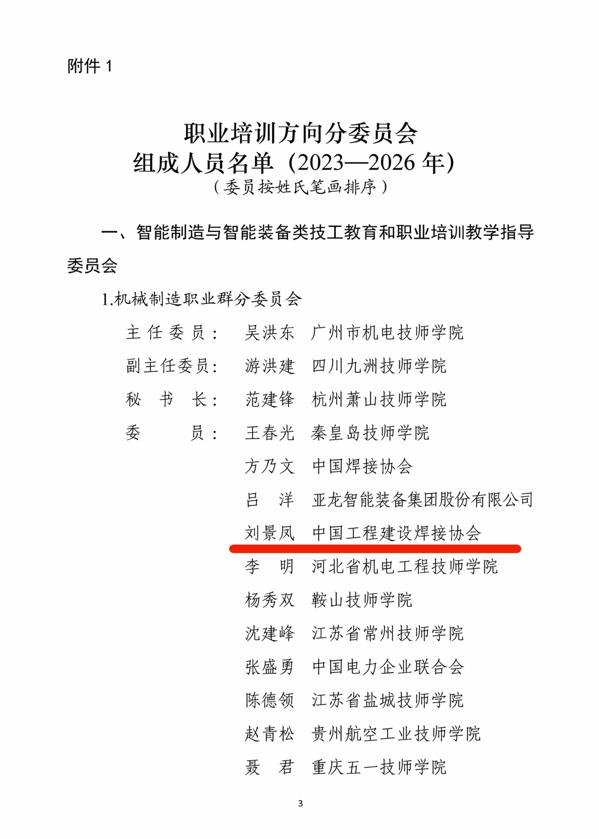 8月16日,人社部技工教育和職業培訓教學指導委員會工作辦公室、教材辦公室正式公布了教指委職業培訓方向分委員會組成人員名單,中國工程建設焊接協會常務副會長劉景鳳、技術質量部主任謝琦兩位專家光榮入選機械制造職業群分委員會委員。