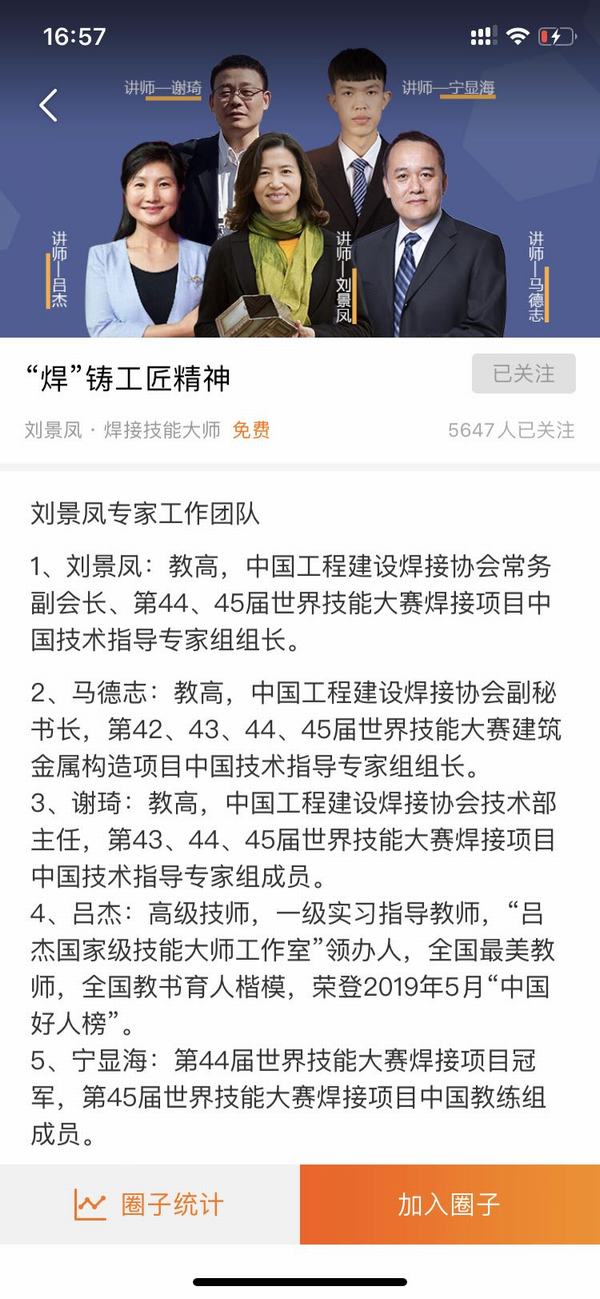 2月25日接到人社部的工作任務后,常務副會長劉景鳳迅速組織召開工作會議,擬定工作方案,為此次直播課程做好策劃及其他準備工作。協會充分利用“技能大師在線培訓平臺”,按照國家職業技能標準要求制定課程,以初級工應掌握的理論知識和技術能力為起點,選擇其中最常用的手工電弧焊、二氧化碳氣體保護焊以及鎢極氬弧焊的平焊、對接、角接作為技能授課的重點。由中國工程建設焊接協會常務副會長,第44、45屆世界技能大賽焊接項目中國技術指導專家組組長劉景鳳;中國工程建設焊接協會副秘書長,第42、43、44、45屆世界技能大賽建筑金屬構造項目中國技術指導專家組組長馬德志;中國工程建設焊接協會技術部主任,第43、44、45屆世界技能大賽焊接項目中國技術指導專家組成員謝琦;甘肅鋼鐵職業技術學院,“呂杰國家級技能大師工作室”領辦人,全國教書育人楷模、榮登2019年“中國好人榜”,全國最美教師呂杰;第44屆世界技能大賽焊接項目冠軍,第45屆世界技能大賽焊接項目中國教練組成員寧顯海組成了專業知識深厚、技術經驗豐富的專家團隊。五位專家分別從焊接基礎及HSE常識、焊接符號及識圖知識、常用金屬材料及金屬材料熱處理、焊接材料及焊接設備、焊接接頭與變形、焊接缺陷與工藝、焊接檢驗、政策法規與世界技能大賽,以及實際操作課程:低碳鋼和低合金鋼的常見焊接操作等方面進行了細致講解,內容深入淺出,應用范圍廣泛,具有較強的實用性,獲得了業內人士的廣泛關注及一致好評,5000多人在線參加了課程學習,在疫情防控期間奉獻了一系列經典的焊接在線教育課程。