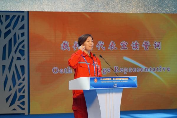 劉景鳳秘書長作為焊接項目的裁判長代表全體裁判員宣誓