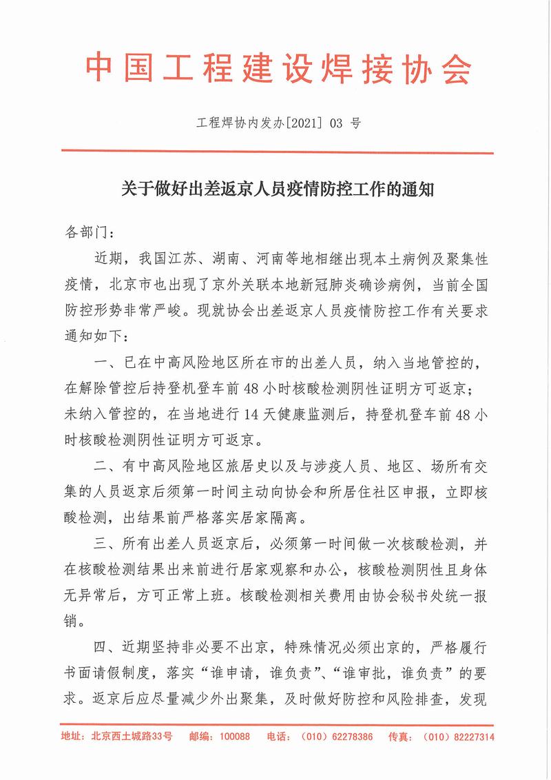 近期,我國江蘇、湖南、河南等地相繼出現本土病例及聚集性疫情,北京市也出現了京外關聯本地新冠肺炎確診病例,當前全國防控形勢非常嚴峻。現就協會出差返京人員疫情防控工作有關要求通知如下: