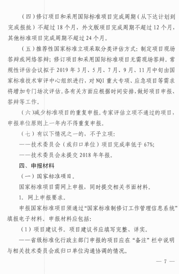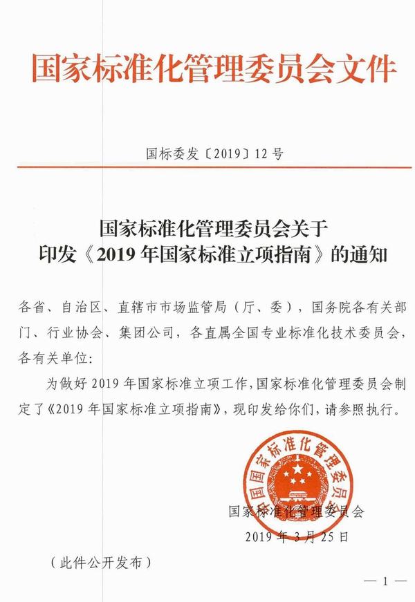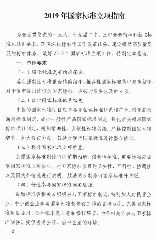 3月25日,國家標準委官網發布了《2019年國家標準立項指南》,《指南》要求強化標準復審結論落實、優化國家標準體系結構、提升國家標準立項質量、暢通參與國家標準制定途徑。詳情如下:
