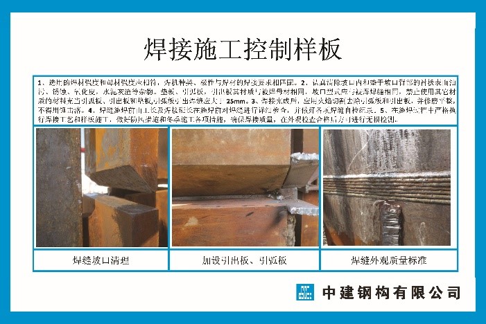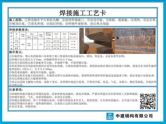 本工程主要鋼構件材質為Q345B、Q345C、Q345GJC、Q390GJC,焊接方式有手工電弧焊和二氧化碳氣體保護焊。為保證焊接質量,加強全過程焊接質量控制。焊前準備,對進場的焊機設備進行調試,保證機具使用要求。焊材準備,現場焊絲取樣復試。樣板引路,在現場焊接操作區域掛設工藝牌及施工樣板,下方附帶二維碼,掃描后鏈接到焊接專項施工方案,使得現場各焊接小班組對工序施工要點、關鍵控制點、質量保證措施等更加熟悉,確保了對焊接施工質量做到了事前控制、統一標準,有利確保了后續焊接工序施工質量。根據《鋼結構工程施工質量驗收規范》GB50205-2001 和《鋼結構焊接規范》GB50661一2011 第六章“焊接工藝評定”的具體條文進行。結合工程的結構特點、節點形式等編制焊接工藝評定試驗方案,經業主或監理認可后實施。焊接工藝評定需邀請業主、顧問和監理參加。焊接完畢后對試樣進行標識、封存運送到檢測單位。技術員根據現場記錄參數、檢測報告確定出最佳焊接工藝參數,整理編制完整的《焊接工藝評定報告》并報有關部門審批認可。《焊接工藝評定報告》批準后,技術員再根據焊接工藝報告結果制定詳細的工藝流程、工藝措施、施工要點等編制成《焊接作業指導書》用于指導現場的焊接作業。
